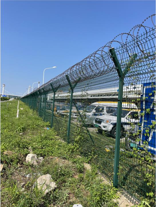 機場圍界防護網的主要構件是立柱、邊框以及鋼筋網,采用浸塑的防腐蝕處理方式,使用壽命長久。另外機場圍界防護網可以有效的保證防