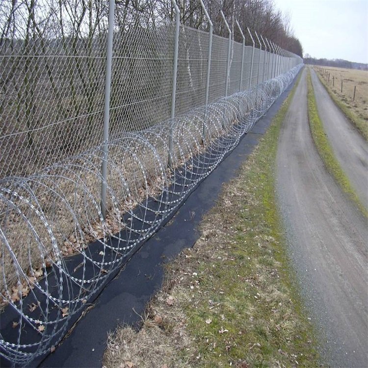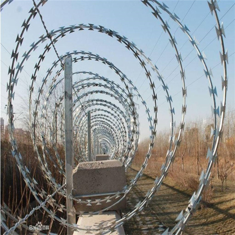 近年發(fā)展起來的防護(hù)、隔離能力較強(qiáng)的新型防護(hù)網(wǎng)產(chǎn)品。它采用鋼板沖壓成型包附于鋼絲之上,由銳利尖角鍍鋅鋼板或不銹鋼薄板做刀片,高張力鋼絲做芯線組合而成的。根據(jù)形狀可分為:螺旋式-刀片刺網(wǎng)、交叉式-刀刺網(wǎng)、平板式-刀片刺網(wǎng)、直線式-刀片刺網(wǎng)。被廣泛應(yīng)用在監(jiān)獄,機(jī)場,軍事基地等高安全場所。