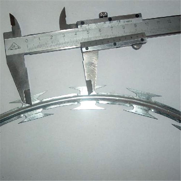 它是用不同材質的鋼板與不同材質的絲兩種原材料組合而成,先把所需材質的鋼板沖壓出刀片的尖刀直條,在和所需材質的絲包裹在一起,在制作出我們所需要的圈直徑即可,刀異常的鋒利,只要觸摸到就會被刺傷,不可能讓非法分子有攀爬翻越的機會,是現代社會各場所圍墻安裝的最佳防護隔離網。