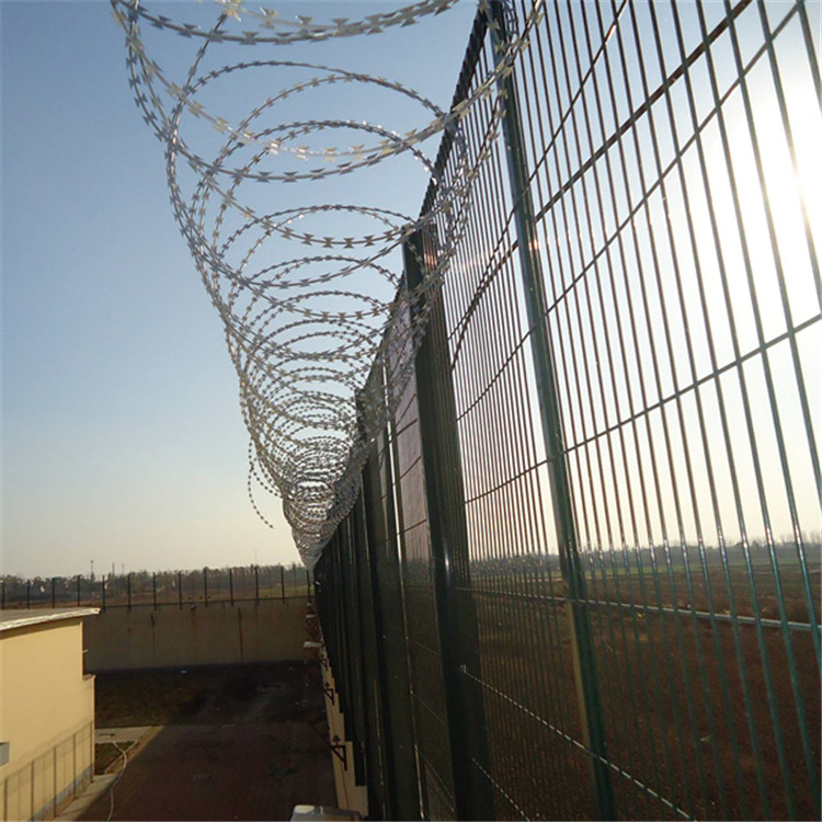V型頂端安裝刀片刺網(wǎng),直徑采用50 cm-60 cm刀片剌網(wǎng)主要是由熱鍍鋅鋼板或不銹鋼薄板沖壓而成的,它擁有尖銳的刀片,高張力鍍鋅鋼絲或者不銹鋼絲做芯線組合而成的產(chǎn)品。