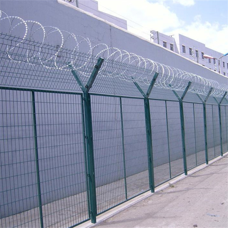 監獄鋼網墻又稱作“Y型安全防御護網”,是由V型支架立柱,加強型焊接片網,安全防盜連接件和熱鍍鋅刀片刺籠組成強度和安全防御性級別很高。近年來,被廣泛應用在監獄,軍事基地等高安全場所。在監獄鋼網墻頂部加裝刀片剌絲、刀片剌繩后又很好的增強了安全防護性能。采用電鍍、熱鍍、噴塑、浸塑等防腐形式,具有很好的抗老化抗曬、耐候等特點。產品造型美觀、花色多樣,既起到圍欄作用,又起到美化作用。由于具有安全性高、防攀爬能力好網片連接方式采用特制sbs緊扣件,有效防止人為的破壞性拆卸橫向四道折彎加強筋,使網面強度顯著增加。