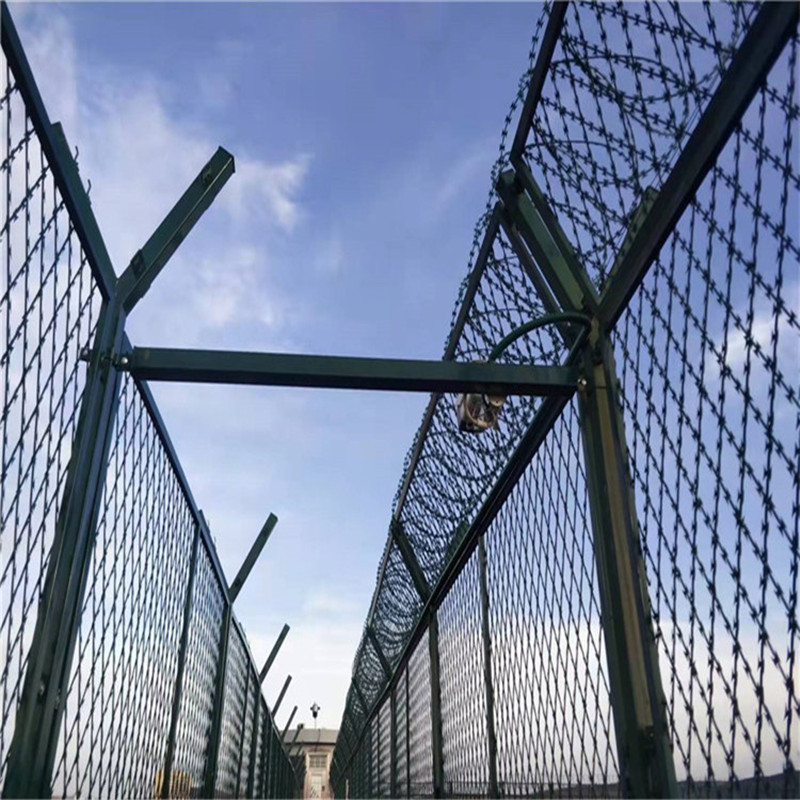 監獄外圍鋼網墻 內墻鋼網墻 圍墻鋼網墻,材質;鐵絲 低碳鋼絲 規格:網高:2.5m—3.5m 網寬:2.0m-2.5m 螺旋型交叉刀片刺網是在兩條刀片刺網之間以不銹鋼片和鍍鋅鋼片強力夾扣,展開后即呈交叉狀,美觀又實用。監獄護欄網防腐形式:電鍍、熱鍍、噴塑、浸塑。